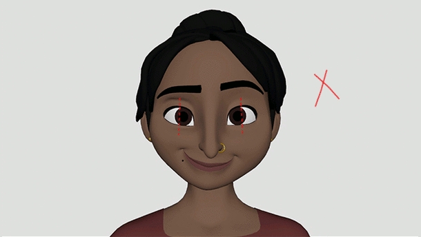 Para obtener una pose de ojos creíble, se debe ajustar los párpados para que el blanco de los ojos esté equilibrado. Es posible que también se deba ajustar el control de iris/pupila, ya que uno de los iris puede parecer más pequeño que el otro. Lo principal es tener el mismo equilibrio de blanco de ojo e iris en cada ojo.
