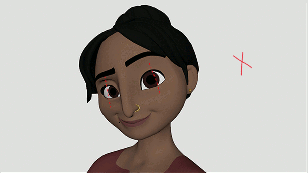 Cuando se utilizan ángulos extremos en la pose facial, es posible que la pupila del ojo lejano quede enterrada debajo del párpado. Para solucionar este problema, se puede ajustar la forma del párpado más alejado e intentar igualar el equilibrio en el otro ojo.