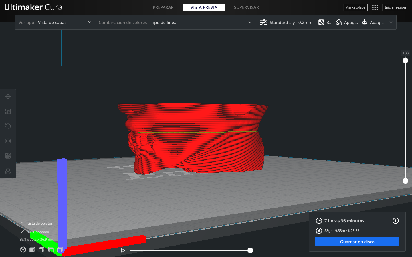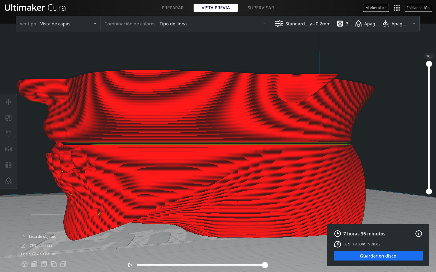 Ahora que me disponía a imprimirlo pensé en preparar de nuevo el modelo para agilizar el tiempo de impresión. Anyways el punto es que cuando hice un prueba para ver en el visualizador como quedaría la impresión me hace falta aproximadamente dos capas al centro de la pieza y no entiendo a que se debe si anteriormente no me daba este problema, les adjunto fotografías y el modelo en OBJ por si gustan revisar algún problema, yo la verdad no encuentro, y no si se sea por la nueva actualización de CURA pues antes no me sucedía.