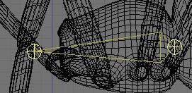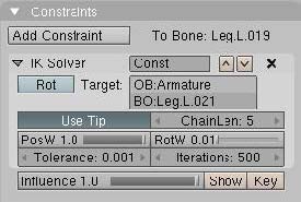 Y ahora el IK Solver. Ve al modo postura con [Control-tab]. Escoge uno de los nuevos huesos que fueron creados anteriormente, y el último hueso de la pata a la que corresponda este nuevo hueso, presiona [Control-i] y escoge la opción todo selected bone. Esto agregara un limitante del tipo IK Solver al hueso correspondiente a la última pata que apunta al nuevo hueso recién extruido. Si intentas mover el hueso objetivo ahora, notaras que el cuerpo completo se mueve y la línea de puntos naranja se devuelve al hueso root. Esto es debido a que el IK Solver sigue la jerarquía de huesos hasta que llega al de mayor jerarquía posible. Para evitar esto, puedes usar la propiedad chainlen: que encontraras en el panel constrains del bloque IK Solver en el grupo editbutton.