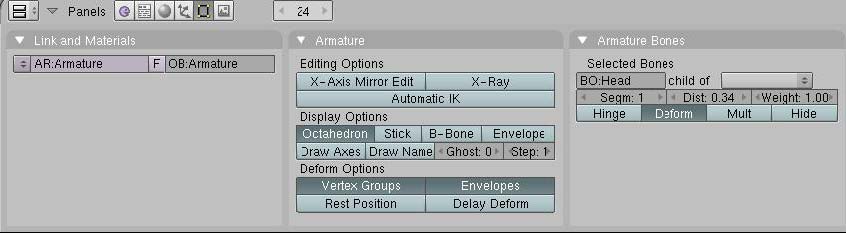Para darle un nombre, presionamos [f9] y veremos algunos paneles que nos serán de utilidad. Lo que estamos buscando está en el panel de armature Bones (huesos de armadura). Si la cabeza del hueso esta seleccionada, veras unos botones bajo selected Bones. Estará el campo bo: que te permitirá cambiar el nombre de este hueso de bone a head. Para ver el resultado en la vista 3d, activa el botón draw name. Esta en el panel armature.