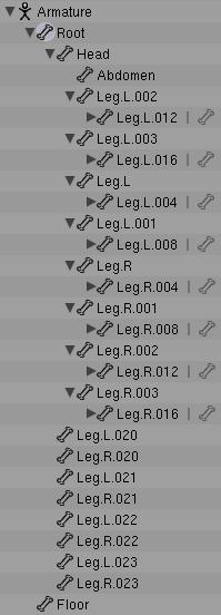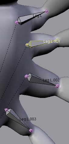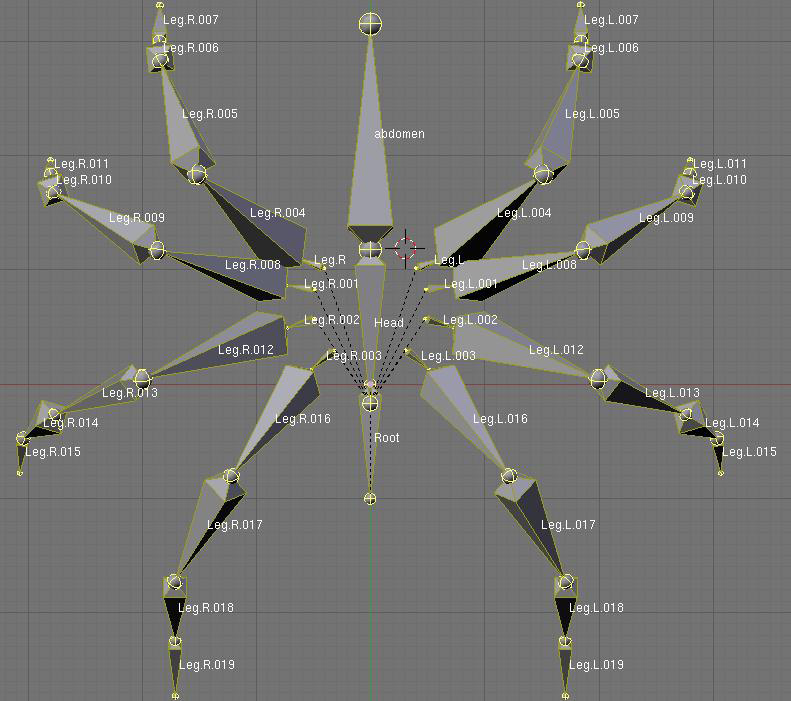 Añadamos un IK Solver (solucionador cinético inverso) para todas las patas. Esto nos permitirá animar una pata completa moviendo un solo hueso. Selecciona el esqueleto y ve al modo de edición. Escoge las puntas de todos los últimos huesos de cada pata. Ve a la vista superior (con [numpad7]) y haz una extrusión de un nuevo hueso de todas ellas. Con todos los nuevos huesos seleccionados, presiona [alt-p] y escoge clear parent. Entonces apadrina todos estos huesos escogiendo uno de ellos y entonces seleccionando el hueso root, y presiona [Control-p]. Tendrás que hacerlo uno por uno.