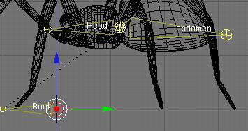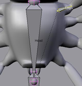 Ahora estas en el Edit Mode (modo de edición) editando el nuevo hueso recién añadido. Hay un hueso dónde está el cursor. Selecciona el hueso haciendo clic con el botón derecho del mouse en el medio de el (el cuerpo). Esto seleccionara tanto la raíz como la punta del hueso. Y ahora puedes mover este hueso donde quieras. El hueso esta conformado de la raíz, que es la bola inferior, el cuerpo que es el octaedro y la punta, representada por la bola superior. Mueve y gira este hueso de tal modo que quede en la cabeza de la araña, el centro de este personaje: este hueso tendrá un nombre, lo llamaremos head (cabeza).