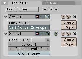 Cuando hayas terminado con los huesos, comenzaremos a preparar la malla para unirla al esqueleto que hemos creado. Para hacerlo, hay que abandonar el modo de edición. Presiona [tab], y luego selecciona la araña, entonces presiona [f9] para que Blender nos muestre los botones de edición y buscamos el panel modifiers.