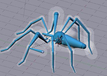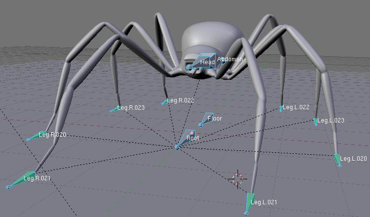 El esqueleto resultante debería permitirte darle posturas a la araña de una forma sencilla. Tan sólo necesitas mover uno de los huesos objetivos IK para mover una pata. Además, puedes mover la cabeza y las patas la seguirán apropiadamente. Incluso puedes elevar el piso (hueso flor) o mover el hueso root para mover la araña. Ahora podemos esconder los huesos que no nos servirán para una cierta animación. Para ello, escoge todos los huesos que no vayas a usar cuando animes, y presiona [h]. El resultado puede ser semejante a esto: