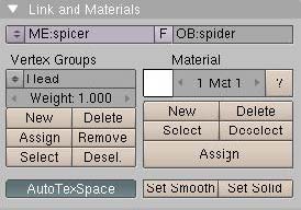 Cuando hayas terminado con las patas, nos aseguraremos que la head y el abdomen funcionan. Para ello seleccionaremos la araña y entraremos en el editmode. Vamos al editbutton y buscamos el panel enlace and materiales.