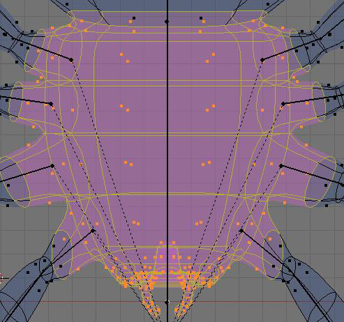Ahora haremos el esqueleto de las 8 patas. No te preocupes, existe una forma de hacerlo con sólo la mitad del esfuerzo. Dado que la araña es simétrica, es posible indicarle a Blender que, mientras nosotros hacemos una mitad, la otra mitad se haga de forma automática. Ve al panel de botones y activa el botón x-axis mirror edit (edición espejo eje x). Presiona [numpad3] para activar la vista lateral y escoge el hueso abdomen y cópialo usando [shift-d]. Esto te dará otro hueso con la misma relación de parentesco que tiene abdomen, head. Muévelo a una de las patas de la izquierda de tal modo que la raíz del hueso quede colocada en la unión de la pata y el cuerpo, y que la punta esté en el medio de la primera articulación visible. Le cambias el nombre a leg. L. Debe quedar algo similar a lo que muestra la siguiente imagen: