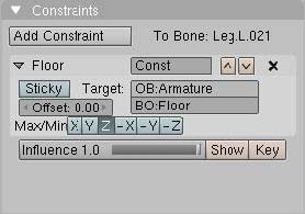 Partamos entonces. Hagamos que Blender nos muestre una vista lateral de la araña (prueba presionando [numpad3]) y dupliquemos el hueso root y lo colocamos a la altura de dónde deba quedar el piso. Este hueso no será emparentado con ningún otro y será mejor así. Este hueso será nuestro hueso de piso. Dale por nombre flor, y ve al modo pose. En el panel de botones de edición, presiona el botón add constraint y luego escoge flor. Debería verse algo similar a esto:
