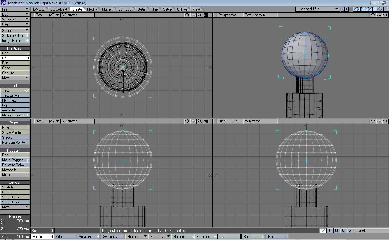 Una duda que tengo es ¿cómo modelar una esfera con hemisphere: 0,16 o el efecto que este produce con LightWave? Y la otra esta relacionada en la transformación de objetos, con 3ds Max seleccione el objeto y en modify se pueden cambiar parámetros como el radio, alto, segmentos, pero con LightWave creo el objeto y no sé cómo modificar esos parámetros.