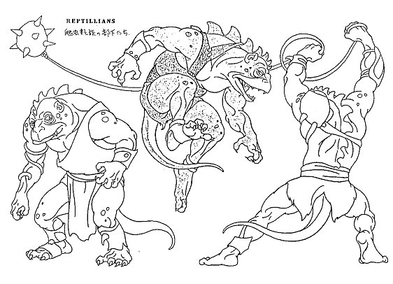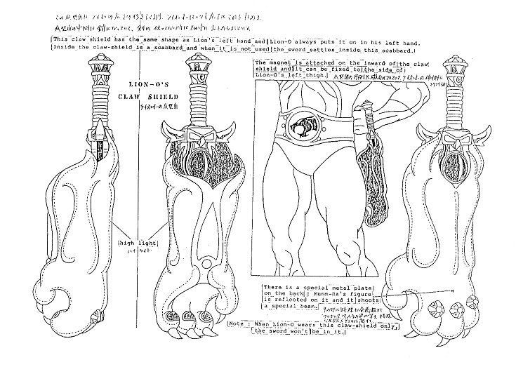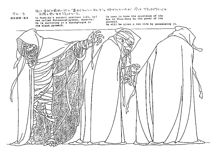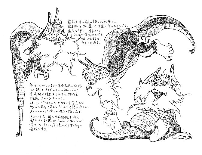 Concept art de los personajes de la serie original, con acotaciones en inglés y japonés.