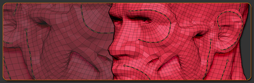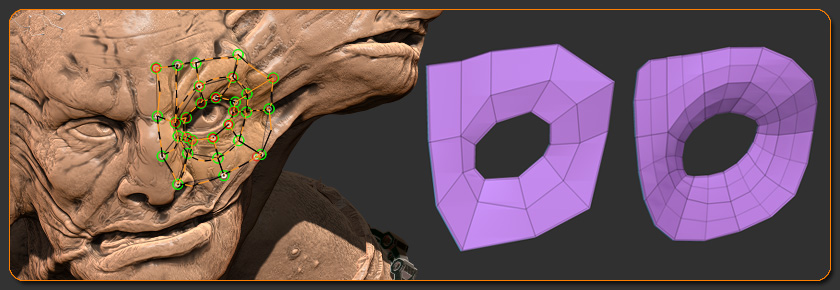 Re-topología brush proporciona un control manual sobre la creación de topología para esas ocasiones en las que se desea retopolizar de nuevo, para darle más precisión al trabajo. Utiliza un motor de curva optimizada de ZBrush 4r4 permitiendo dijuar polígonos nuevos sobre la marcha, con un simple clic sobre la superficie de apoyo genera instantáneamente los nuevos polígonos, con o sin espesor, remplazando esa parte de la malla anterior.