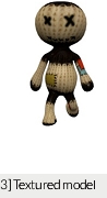 An engaging bak story was the bien todo go, After the concept and bak story were defined the group began modeling using Blender. The character was developed starting from a simple Cube where a mirror modifier was applied and then was built up using extrusión and face modification todo achieve the shape of the ragdoll. Then the models Faces were Unwrapped and imported into Adobe Photoshop as a 2d image, where the texture was Painted. A wol Cloth texture with colored patches was used todo emphasize the ragdoll aesthetic [fig.3].