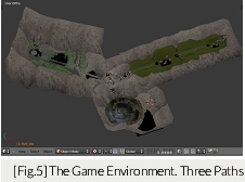 The next step was todo model the game environment and props. As the aim was todo provide a non-linear explorative game-play, the gameworld (Valley of forgotten dreams) was developed as thre diferent dangerous paths at the end of which one of the tokens was situated [fig.5].