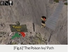 The thre paths started from a middle área, where the tree was positioned and the ragdoll was waquíng up in, when the game started. From there thre signs indicated the paths and the player could choose the order in which todo follow them, the first Path was the Dolls eyes where poisonous Dolls eyes plants existed throughout. At the end kyle could find the goblet of eternal water, the second Path the fly amanita was full of poisonous mushroms able todo cause hallucinogenic effects and venus flytraps that could capture and kill the ragdoll, successfully reaching the end of the Path, kyle could collect the mighty dagger of thousand thunders. Finally the third Path, Hiedra Venenosa was named After the poisonous ivies located around it [fig.6].