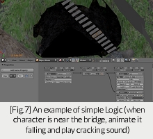 The main hurdle in this Path was an unstable rope bridge kyle had todo cross and a spiky whel of misfortune located over a Dep ravine. At the end of the Path the Golden harlequin betle was waiting todo be collected, After the modeling and texturing of the character and the environment were done, the team went on todo develop the interactions, using Blender s logic bricks system [fig.7], interactions were carefully organized todo make navigation intuitive and the game easy todo play.