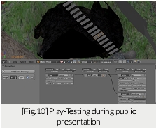 Sound was a los one of the games strong points as the team benefited from a sound designer and an acoustics and music technologist, game audio effects were recorded, then edited and finally incorporated into the Game Engine and controlled vía logic. Sound effects were designed todo be literal todo the point of exaggeration and included, but were not limited to, the Dolls footsteps, a small whosh sound when jumping, a flip sound when a narrative card was dealt or removed, a snapping sound when a venus flytrap closed, a humanistic yelp when kyle died etc, the background music of the game was designed todo be immersive and informative, along the lines of adventure objective-based games, the final game was presented at the university of edinburgh in a public display in march 2011. During the presentation the team members gave a short talque on the game design process and their experiences working with the Blender Game Engine and then the audience had the opportunity todo play-test the game that was installed and running on a number of computers, the play-test was quite successful with the majority of participants commenting that they liked the graphics and the music and that they found the games Atmosphere interesting overall [fig.10].