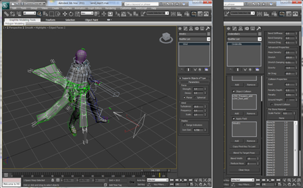La alta calidad de los personajes de juegos 3d por lo general requieren movimientos secundarios muy detallados, como tela, pelo, accesorios, etc. Sin embargo, ezcloth pueden crear tales mociones secundarias fácilmente sólo con unos pocos clics en los modelos de los personajes existentes. Además, de esto, se puede convertir a mallas poligonales de piel en objetos dinámicos y suavemente generar movimiento basado en la física de la malla de piel con la técnica de manipulación excepcional entre mallas. El movimiento generado se genera en las rotaciones de hueso, por lo que tiene ezcloth posible sustituir el tiempo de animación de cada fotograma clave con simulación automática en lugar de tales animaciones secundarias sin ninguna modificación, sobre los actuales caracteres de piel con los huesos.
