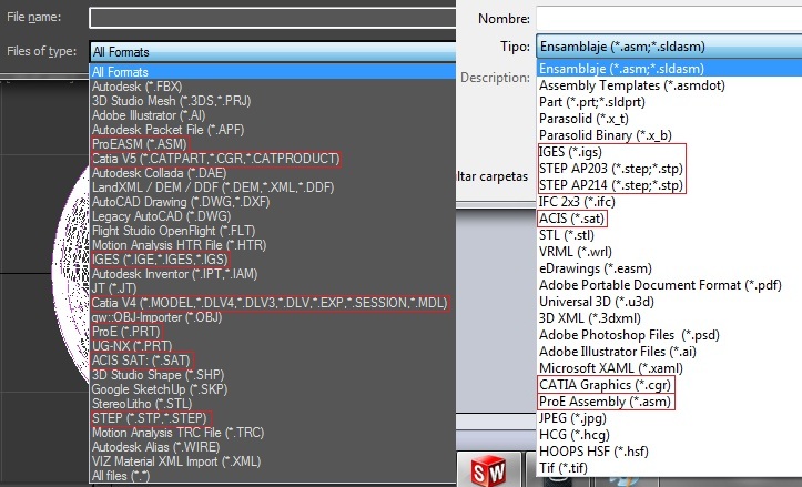 Vaya, las capturas son de SolidWorks 2012 y 3ds Max 2013, no sé si las otras versiones reconocen los mismos tipos de archivos. Saludos y espero haberte ayudado.