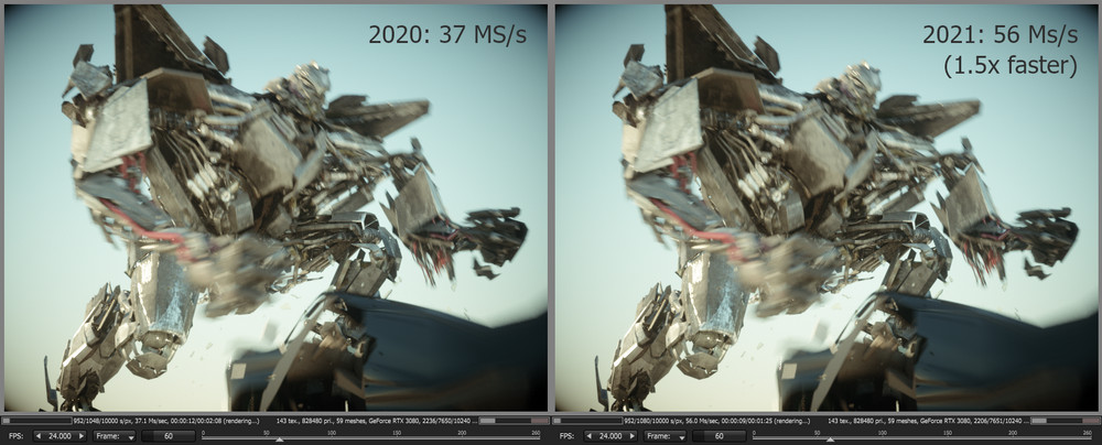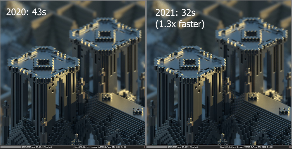 Como parte de la colaboración continua con Nvidia, el rendimiento del trazado de rayos con RTX también se ha mejorado en la mayoría de las escenas de producción. Obteniendo resultados generales de renderizado más rápidos.