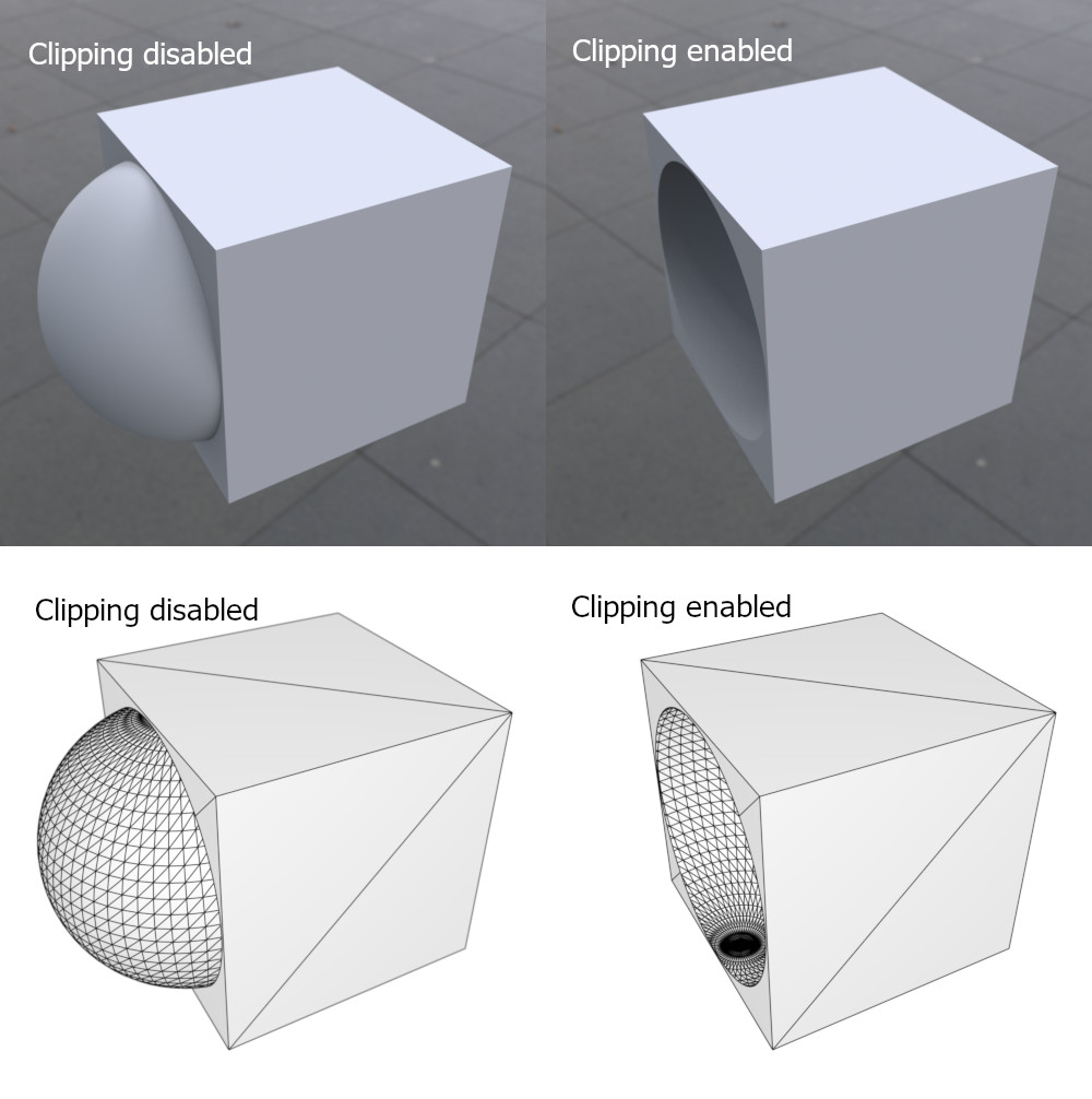 - Se fijaron diferentes artefactos utilizando material de recorte, causado por un gran épsilon de rayos para una malla convexa nítida con un ángulo agudo. Para eso, se agregó una opción de épsilon de rayo personalizado al material de recorte.