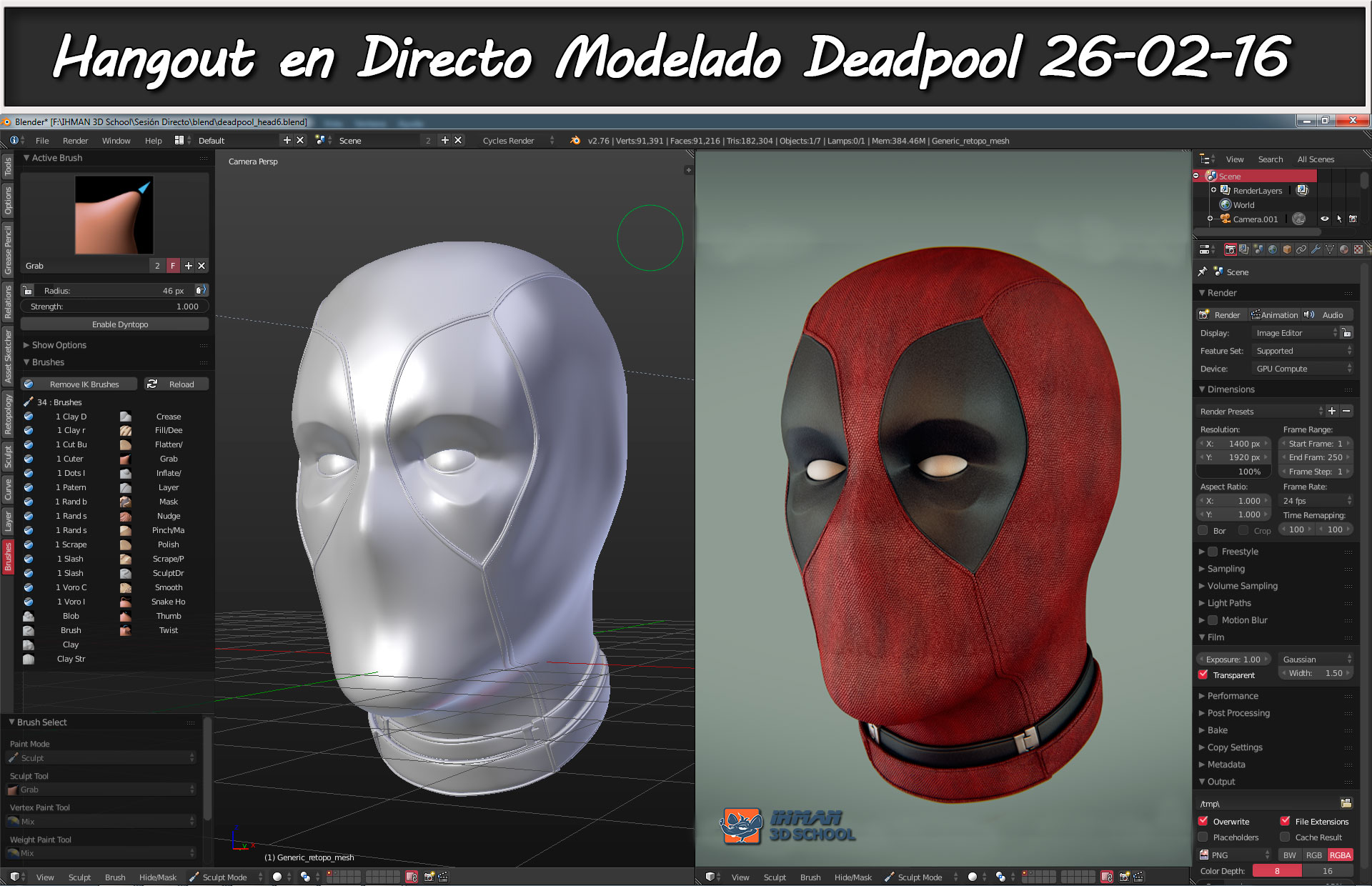 Hoy es traemos la grabación del Hangout que realizamos el pasado día 26 sobre el modelado, texturizado y render del busto de Deadpool, para qué tanto los que asististéis como lo que no pudistéis, podáis visualizarlo, además en nuestro blog encontraréis materíal descargable para qué podáis practicar en casa.