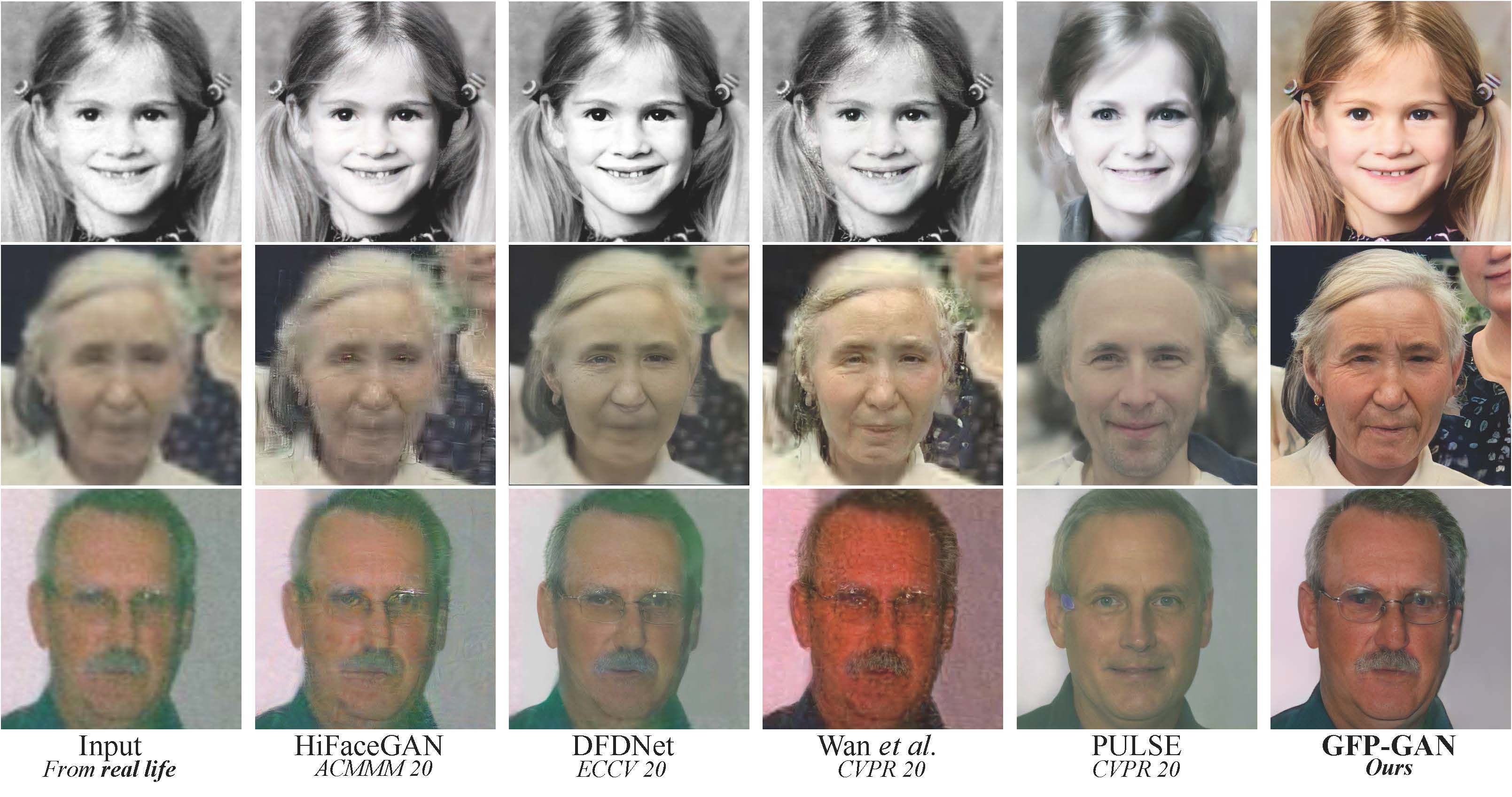 Gracias a los potentes diseños faciales generativos previos y delicados, este GFP-GAN podría restaurar conjuntamente los detalles faciales y mejorar los colores en pocos pasos.