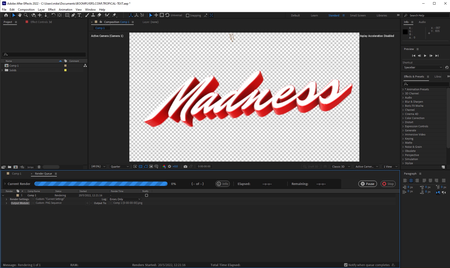 Al día siguiente abrí el archivo para modificar el texto (solo cambié la palabra) y ya no pude renderizarlo, se queda pensando, procesando pero sin ningún dato de tiempo o avance del render. Lo mismo pasa en Encoder, se queda en bucle sin avanzar. Mi versión de After Effects es 2022.