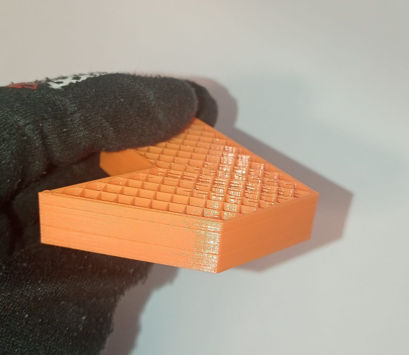 En la parte del relleno, se ve más claramente que falta extrusión, y no se porque las paredes, como había mencionado, tanto exteriores como interiores, están separadas, lo que hace que la pieza sea muy frágil y de mala calidad. También a veces me ha llegado a suceder que en las superficies, no se rellena completamente, y no queda liso, sino como una rejilla, pero creo que ese problema ya lo solucione, ajustando el tornillo que sostiene el resorte del extrusor.