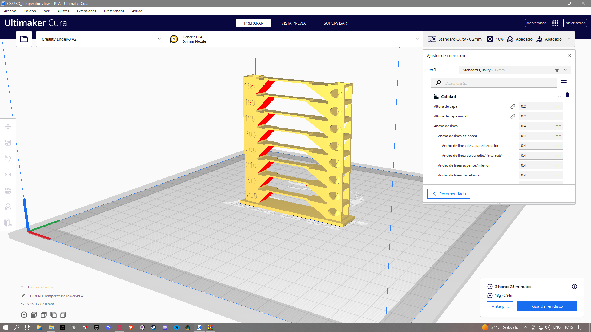 Utilizo Cura, he intentado con un perfil de ender 3 pro estándar y otro personalizado, filamento Creality PLA a 205 y cama a 60 grados.