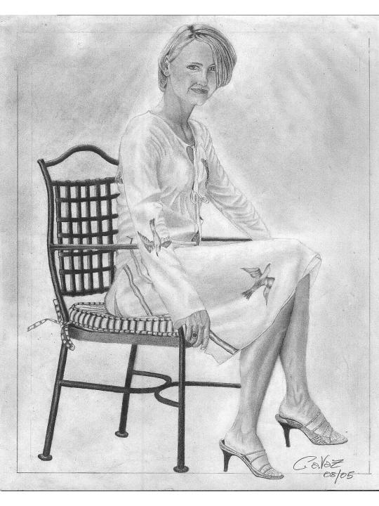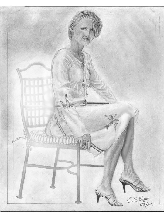 Ya que utilizas unos lápizes tan blanditos procura darle una poco más de contraste en general, sobre todo en las sombras que siempre te ayudan a conseguir mayor volumen y que no parezca que todo está en primer término, de esa forma quizás no te haga falta aclarar mucho la silla.