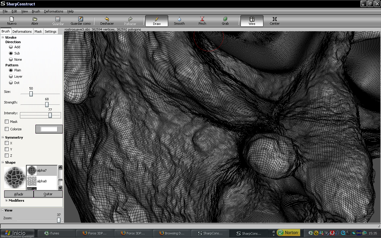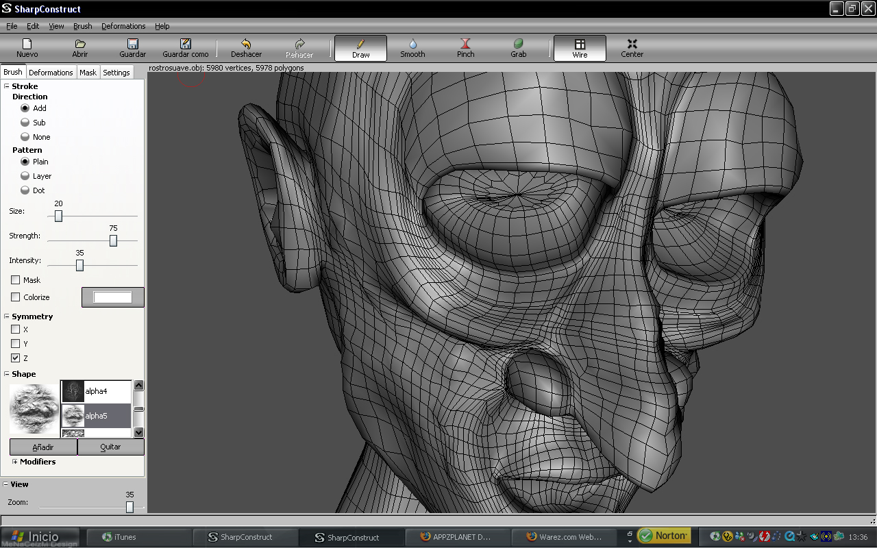 Juraría que había leído de este programa por aquí, pero he utilizado el buscador y nada. En todo caso, ya han hecho un par de ports a Windows de este programa, y funcionan bastante bien. Sharp construct es una especie de clon de ZBrush, pero por ahora sólo deja esculpir las mallas como aquel programa, es decir nada de crear mapas de normales ni de relieve, y tiene muchas menos utilidades que, aquel. No obstante funciona primorosamente para esto de esculpirm utilizando alpha maps como ZBrush y tal. Trabaja con fichero.obj, pero no obstante, he tenido problemas para importar mallas base desde Blender. Sharp construct comienza por defecto con una esfera.