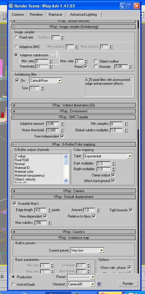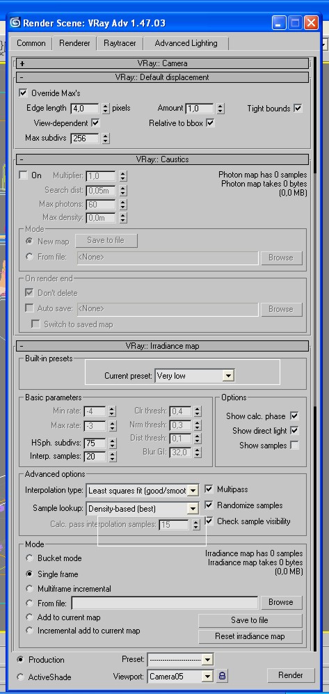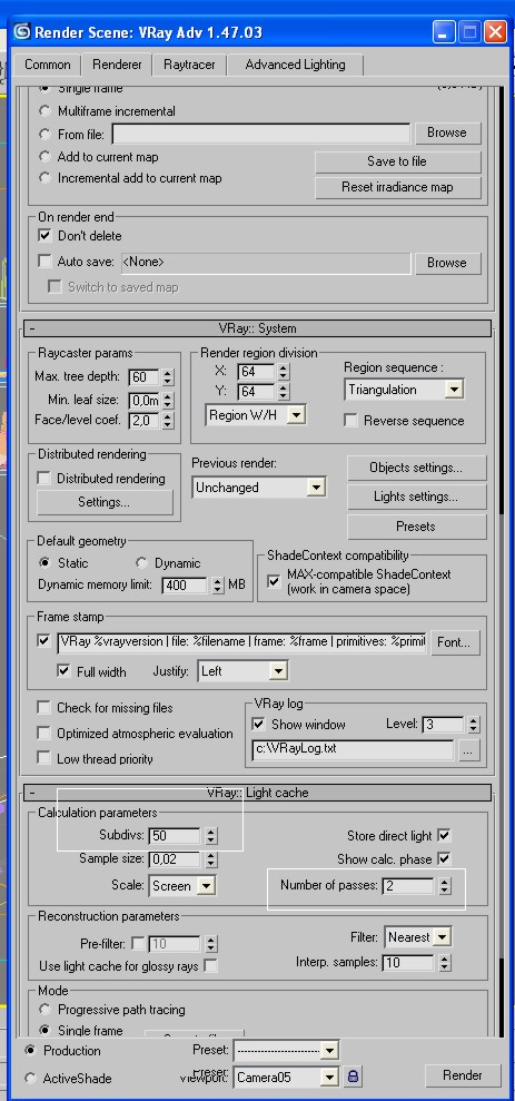 Estoy realizando la visualización de un baño y estoy experimentando dificultades en el cálculo de la escena en Vray. He revisado los hilos de conversación en un foro de discusión con casos similares y he modificado los siguientes parámetros: