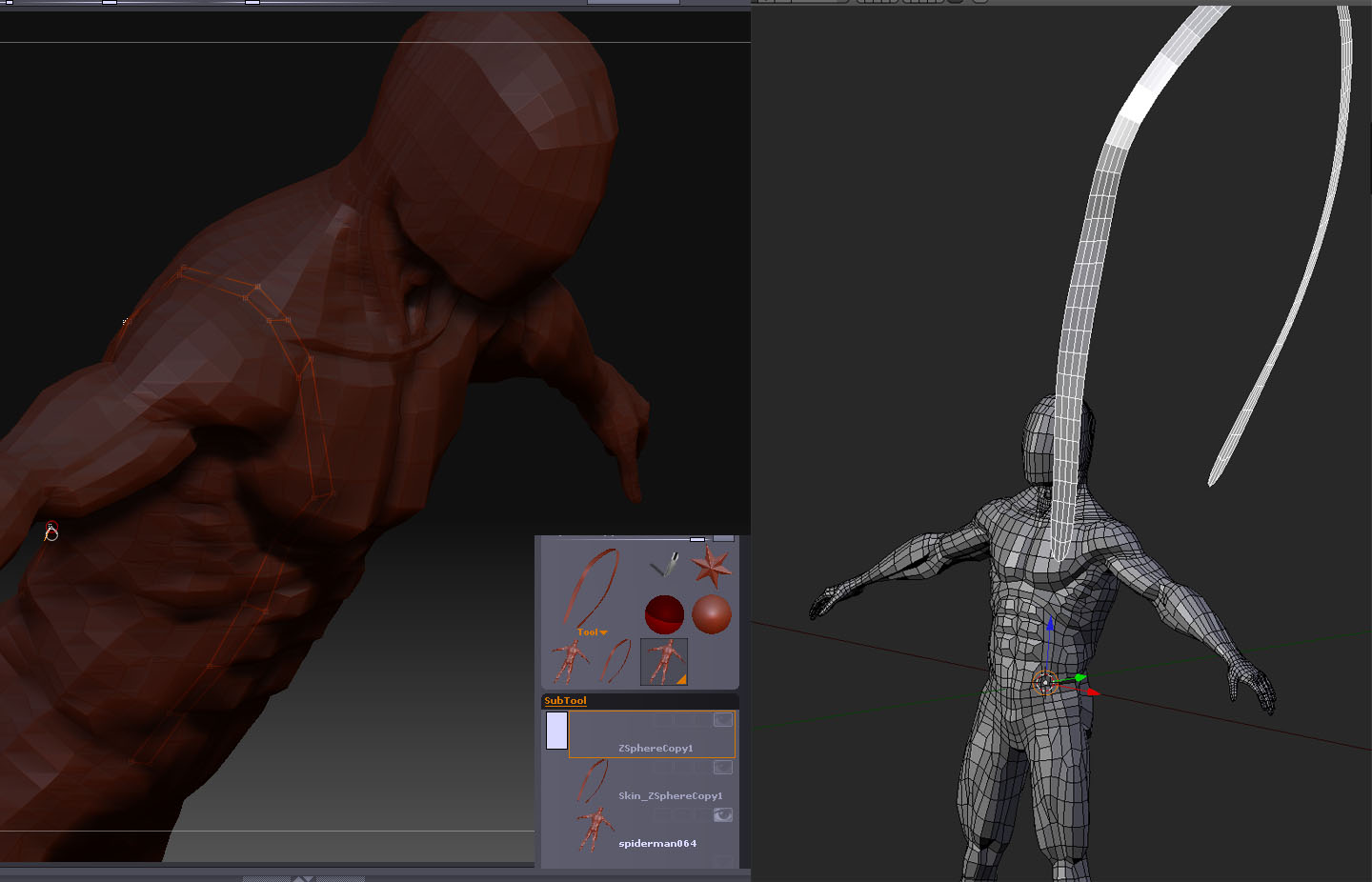 Después este tirante y el modelo humano los añado a los subtool, selecciono el tirante y lo exporto como obj. Selecciono el modelo humano y lo exporto como obj.