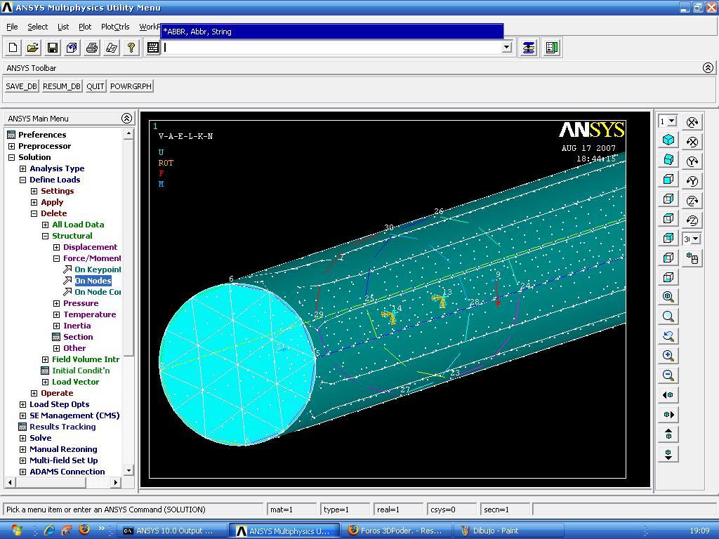 Nota:tanto las cargas como las constricciones están aplicadas en el eje central del cilindro y sobre nodos.
