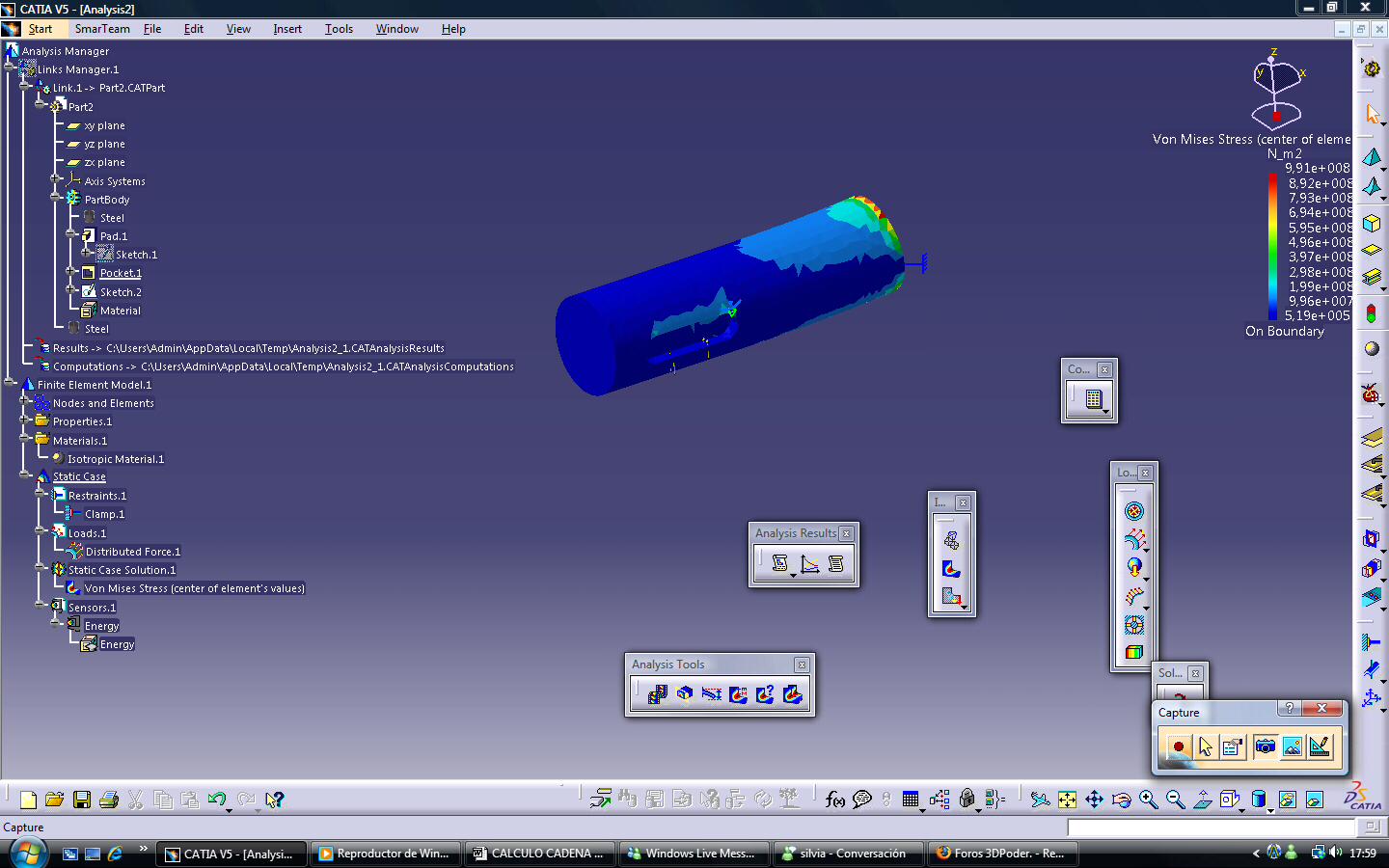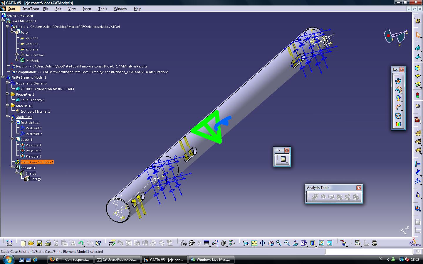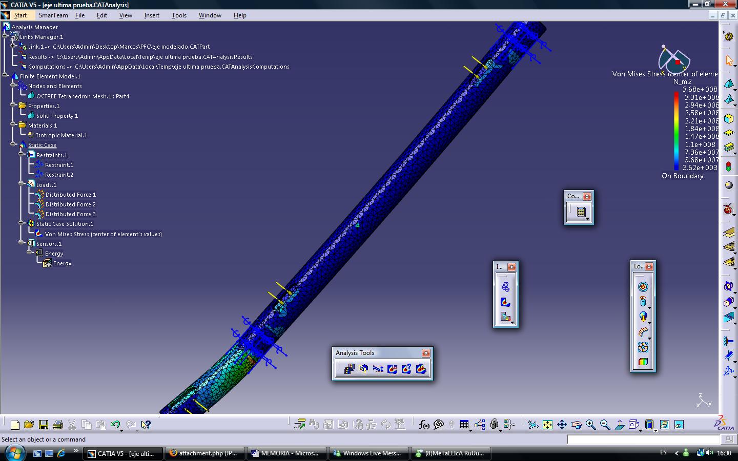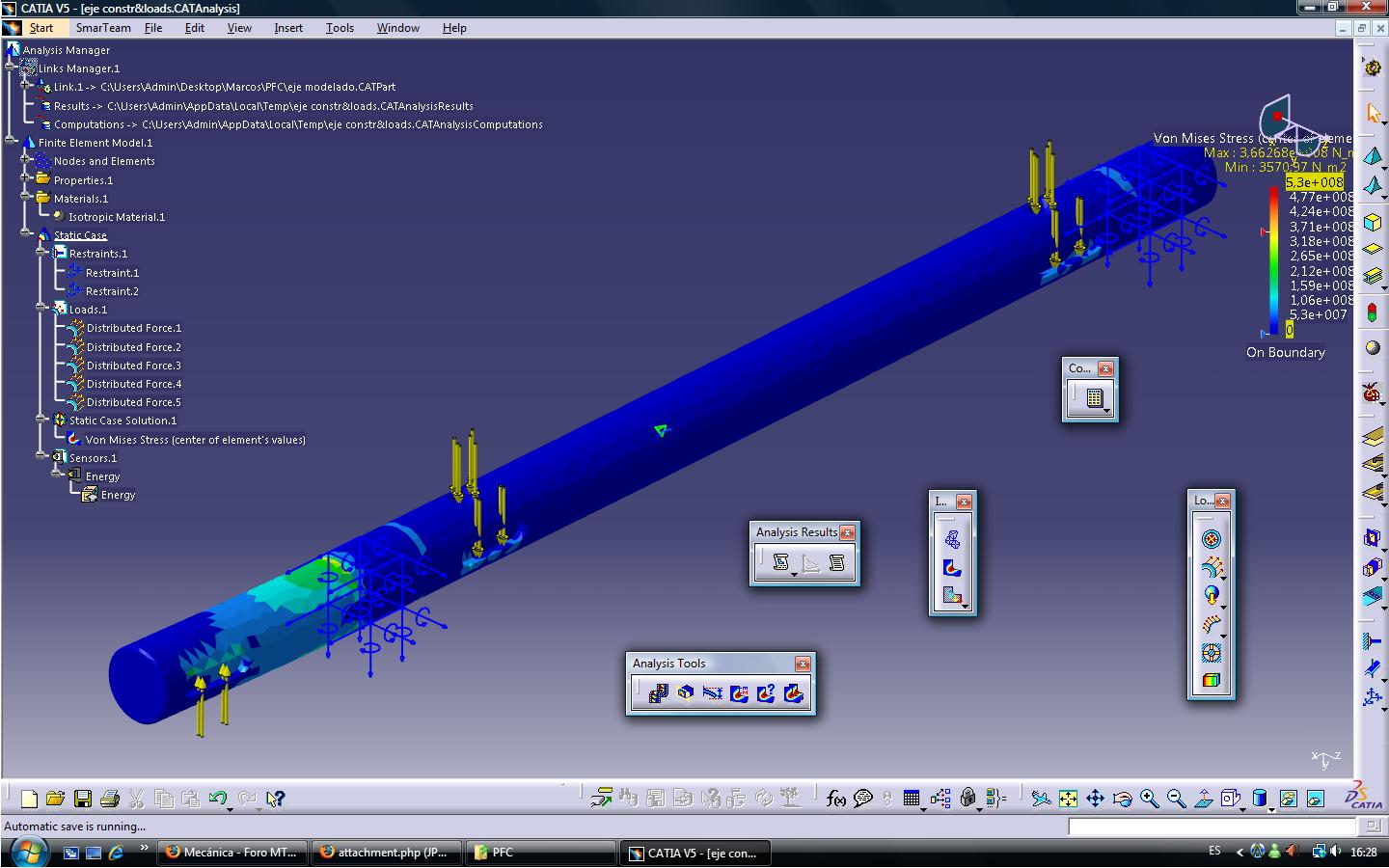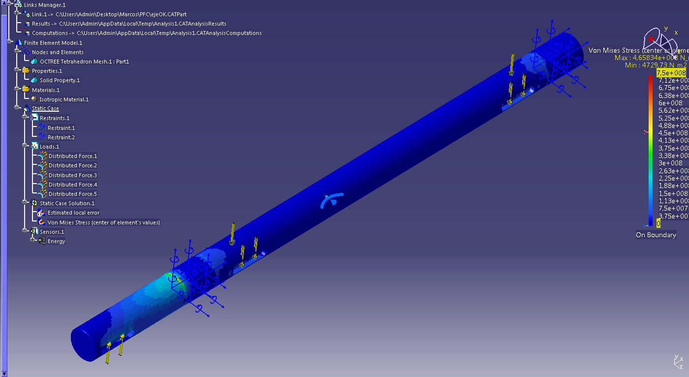 Fiti, ya está Catia instalado y funcionando. He modelado el eje y a partir de aquí estoy especulando. Si me pudieses dar los pasos necesarios para hacer el análisis. Tan sólo algo muy esquemático para saber por dónde tirar.