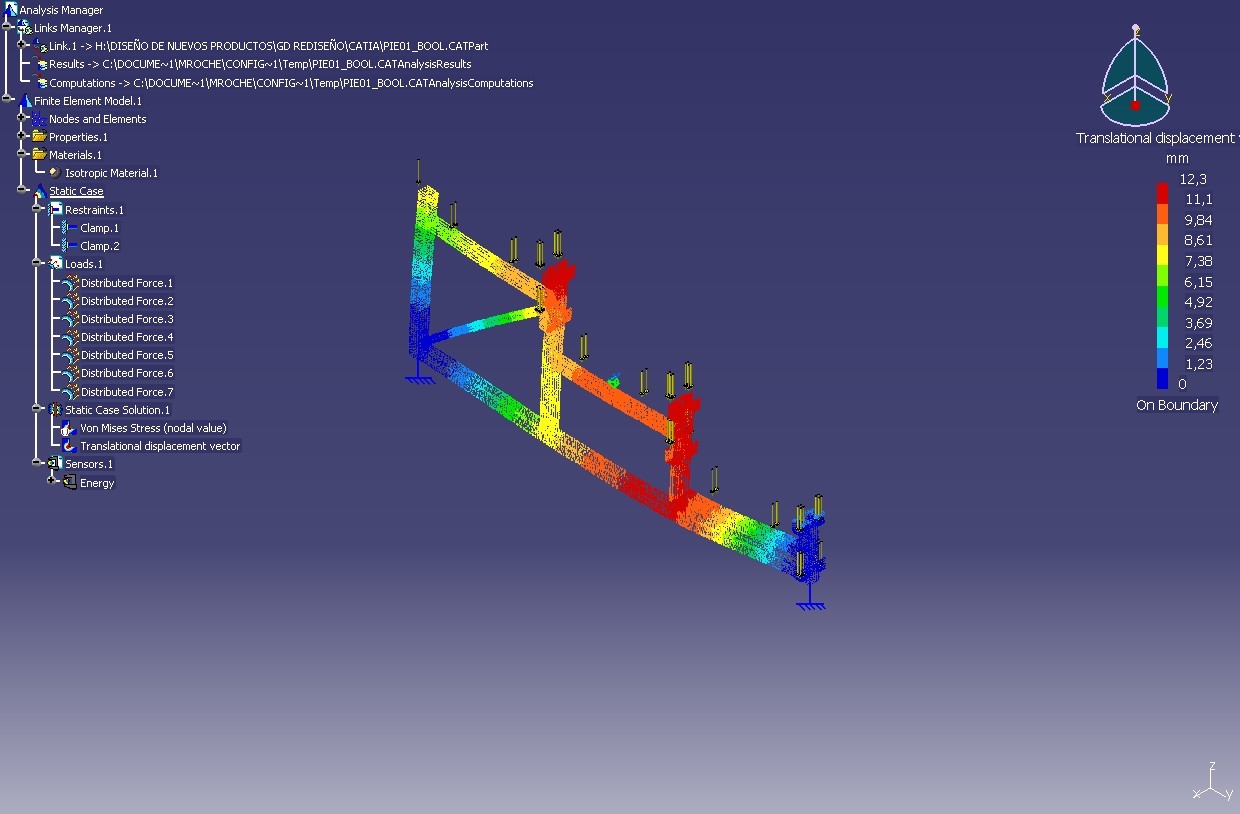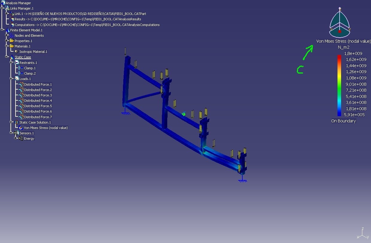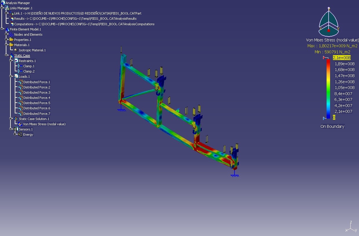 Cuando obtengas el gráfico de la tensión, es posible que veas un resultado que supere el límite elástico y de una imagen distorsionada del reparto de tensiones. Como te dije en uno de los primeros mensaje del hilo hay que saber relativizar esto, ya que es normal que aparezcan picos de tensión en las uniones entre piezas, o en lugares muy concretos de una pieza (entallás, etc). En Catia puedes hacer doble click sobre el título Dell gráfico (c) para escalar el gradiente de tensiones para poder comprender mejor cómo trabaja la pieza. Yo suelo poner como valor mínimo el 0, y como mayor el límite elástico. Puedes ver el resultado en las imágenes que, adjunto. Tras modificar la escala del gradiente, se ve claramente que una parte muy grande del conjunto ha superado con creces dixho límite, con lo que el diseño no es valido.