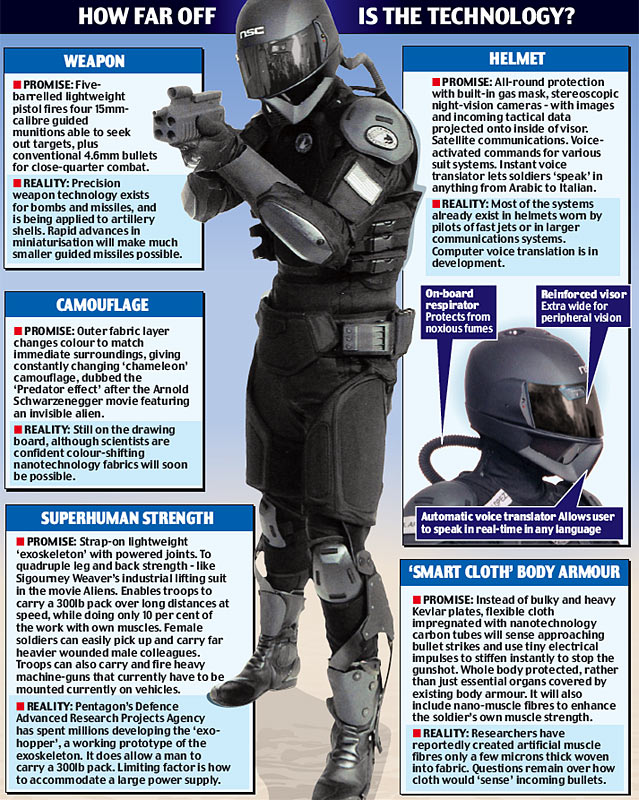 Soldado: su traje se asemejaría algo a los típicos trajes actuales contra la guerra bactereológica (por cierto, los he visto mucho en vivo y en directo y acojonan, sobre todo el ruido de las botas, algo que en ningún videojuego que yo halla jugado hasta ahora se ha tenido en cuenta), pero eso sí, sería más un esoesqueleto, no algo tan ancho tipo XXL, el camuflaje o mimetizaje (que palabreja) sería en tiempo real, nada de colores fijos, tendría buena protección anti fragmentos en piernas, brazos y cabeza, y mucho mejor en el torso, por supuesto con su propia tecnología integrada, tanto de comunicación, como visión, controladores de constantes vitales, no sé por qué, pero me viene a la mente ahora esos mapas anatómicos del sistema sanguíneo humano, podría tener su propio sistema de plasma integrado, se alejaría algo de los típicos acabados de acero indestructible, para acercarse más a las nuevas aleaciones de acero y fibra, por supuesto el acero más para las partes no móviles del cuerpo. Y estos, estarían hasta el culo de drogas/sustancias para no sentir miedo, daño, cansancio, estrés, tener una forma física descomunal, creo que serían tíos muy robóticos en cuanto a su psicología.