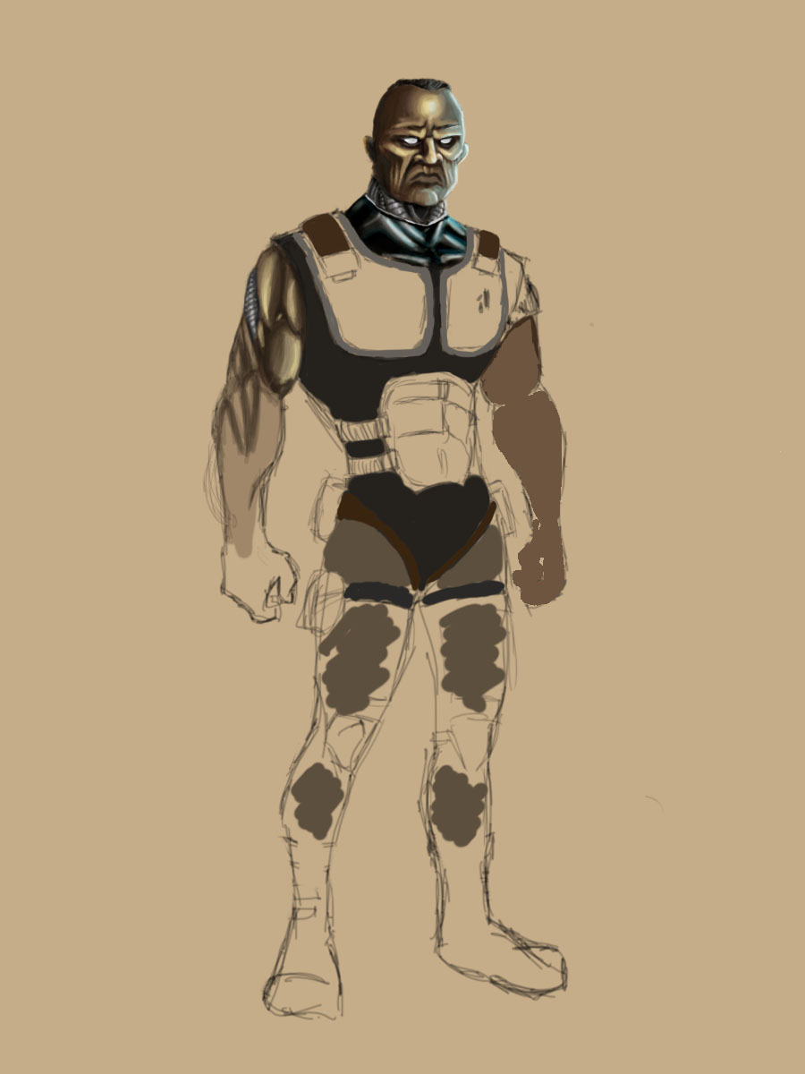 Ok tendré en cuenta esas aclaraciones para los próximos diseños. Pero me he puesto a diseñar el soldado, y pensando en lo que dices, primero, la infección se propaga en una base militar aislada, por lo que los soldados no estaban ni mucho menos preparados para salir a la batalla ni para la infección, por lo que pueden ir desprovistos de mucho del equipamiento que nombras. Colocandole todos los cachivaches que nombras plantea un problema, el cuerpo quedaría cubierto en su totalidad, y creo que es interesante que se vea como le aparecen los objetos metálicos en la piel.