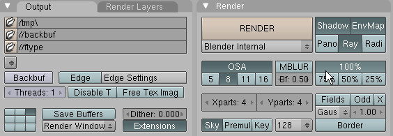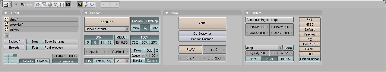 - seleccione avi Raw como el tipo de fichero que vamos a utilizar en el panel formato (format) (configurando los botones de renderizado para una animación.). Mientras que esto no es una buena elección generalmente, principalmente por problemas de tamaño de archivo (como se explicara más tarde), tiene la ventaja de ser rápido y funcionar en cualquier ordenador, así que, cumple nuestras necesidades. (puede también seleccionar el formato avi jpeg para obtener un fichero de un tamaño más reducido, pero utilizando la compresión por pérdidas jpeg y obteniendo una película que algún reproductor externo puede no ser capaz de reproducir).