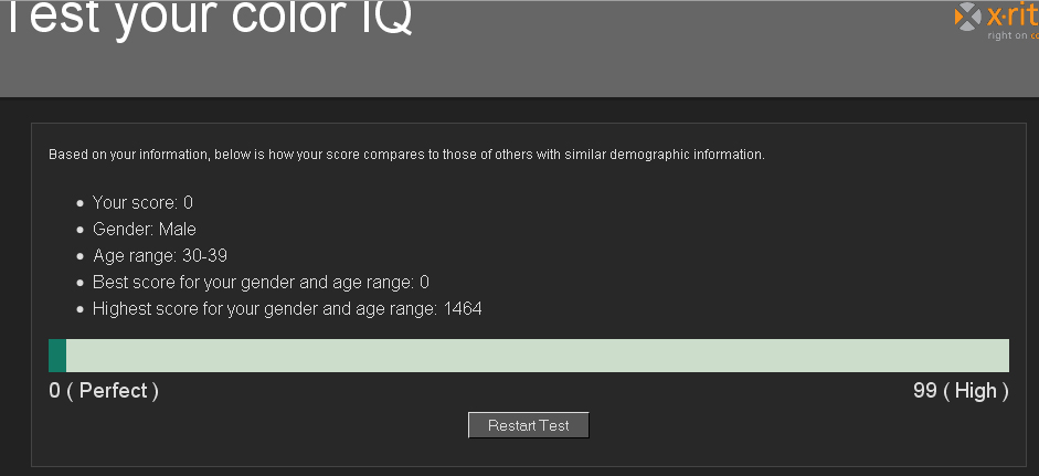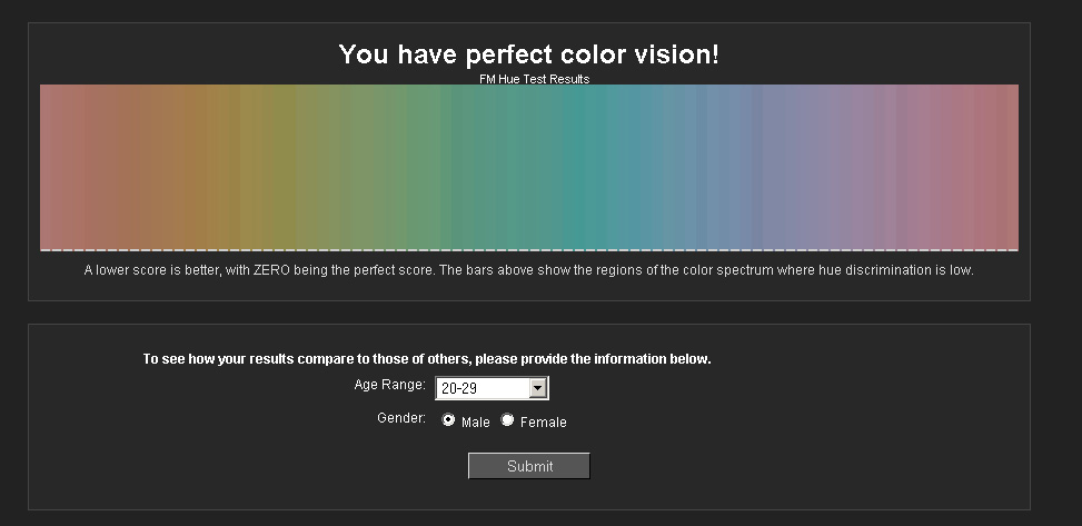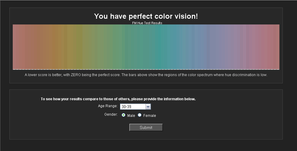 You have perfect color visión. En un CRT calibrado. Qué bien, y eso que tengo astigmatismo en un ojo y miopía en el otro, (¿aunque esto no debería influir en la manera en que aprecio los colores, si me he fijado que con el ojo derecho veo todo con un leve filtro rojizo y con el izquierdo veo todo un poco más azuloso o medio verde, alguien sabe por qué me pasa esto?