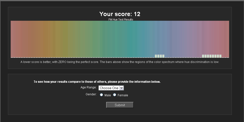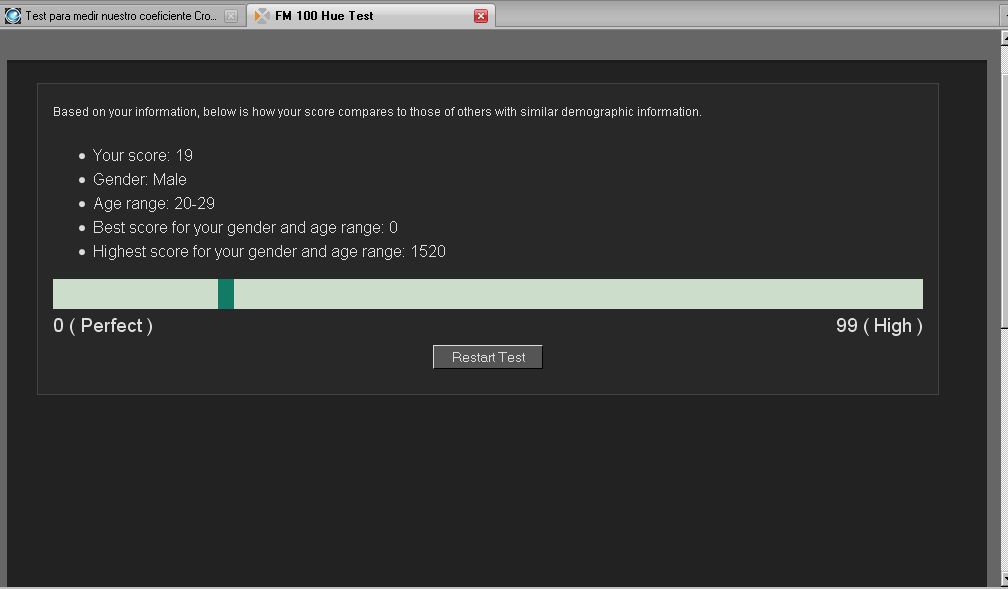 En este test deberemos ordenar las 4 escalas de colores, en cada escala encontraremos dos colores en los extremos que nos servirán de referencia para ir arrastrando los demás cuadros según su orden cromático, al final suministraremos nuestro rango de edad y nuestro sexo (no sé en qué incidirá esto en el resultado) para que nos dé una puntuación, siendo 0 el puntaje perfecto y de 1000 en adelante una cita con el oculista.