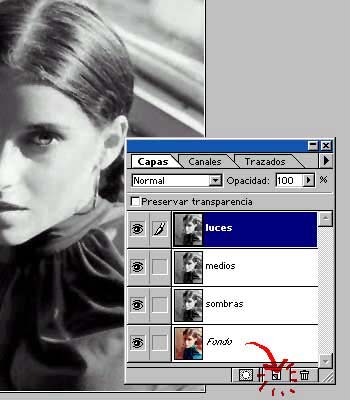 Duplicamos la capa fondo, para hacerlo más rápido y fácil posible pinchamos sobre ella y soltamos sobre el botón de la hoja del panel capas tal y cómo se muestra en la imagen. Después debemos desaturar la imagen (imagen/ajustar/desaturar mayúsculas + Control + u). Si la imagen es demasiado pálida u oscura podemos usar los efectos de contraste y niveles automáticos para corregirlos (imagen/ajustar/niveles automáticos mayúsculas + Control + l y imagen/ajustar/contraste automático Alt+mayúsculas.+Control + l). Repetimos la capa un par de veces más, hasta tener 3 copias de la misma, y les ponemos esos nombres. Luces, medios y sombras. Esto no es esencial, pero ayuda a comprender su función. Y por último creamos una nueva capa vacía (capa/nueva/capa. Mayúsculas+Control + N o pinchando en el botón de la hoja del panel capas) entre la capa fondo y la capa sombras y la rellenamos con un color vivo y plano (usando la herramienta bote de pintura o Alt+back space), nada de degradados por ahora.