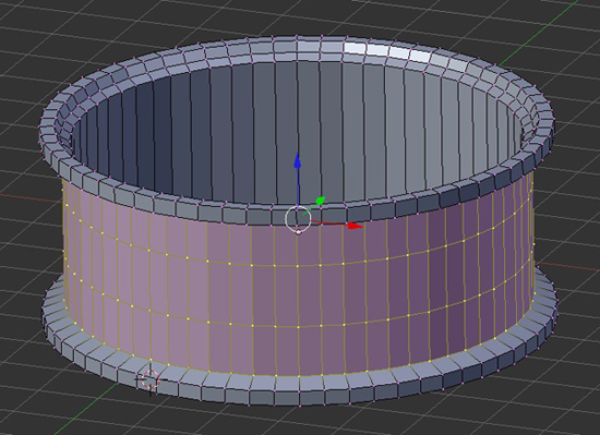 Now we are going todo model the Walls around the Rim where the tire goes. Select all the Faces along the outside of the tuve. Make sure you do not select the Faces from the inside or you Will be in for some headaches. Use the Knife tool (shift + k), select multi-cut and enter the value 3. Your work should resemble fig 7.