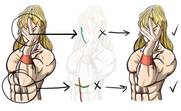 link) líneas del codo parecen mezclarse con las líneas de los abdominales. Siempre y cuando sea posible hay que evitar este tipo de cosas si nuestro objetivo es que la figura se lea a golpe de vista, de otra manera requiere un esfuerzo extra para el observador seleccionar que líneas pertenecen a cual parte.