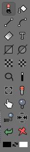 El conjunto de herramientas de dibujo de Howler se muestra como una serie de iconos en el Panel de herramientas. El panel de herramientas puede ser de 1 columna o, flotando libremente, o puede estar acoplado a la barra lateral a lo largo del lado izquierdo o derecho de la ventana principal. El panel de herramientas tiene funciones para dibujar, hacer selecciones, administrar el estado de vista (panorámica y zoom) y borrar la imagen y deshacer y rehacer los cambios realizados.