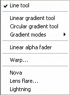 Archivo adjunto 233647 La función básica de las herramientas lineales es dibujar líneas. Sin embargo, hacer clic con el botón derecho en esta herramienta le permite seleccionar entre una serie de funciones que incluyen degradado lineal, degradado circular, deformación, atenuador alfa lineal, Nova, destellos de lente y relámpagos. Ver herramientas lineales.