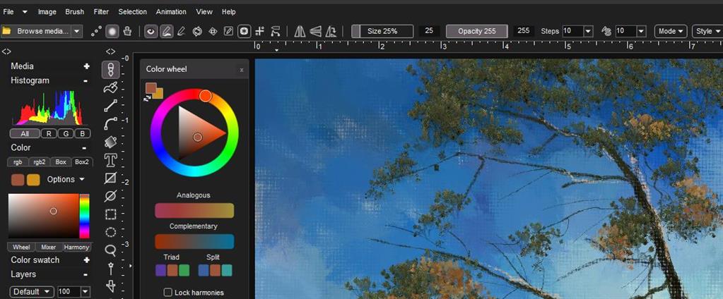 Archivo adjunto 233632 La herramienta de pintura natural activa las poderosas capacidades de pintura de medios naturales. Consulte la sección sobre Herramientas naturales con inteligencia artificial, seleccionar la herramienta de pintura natural, se muestra un conjunto único de controles y configuraciones asociadas en la tira de contexto. Quizás la opción más importante aquí es el botón "Examinar medios", que le permite seleccionar entre muchos preajustes de medios de dibujo diferentes.