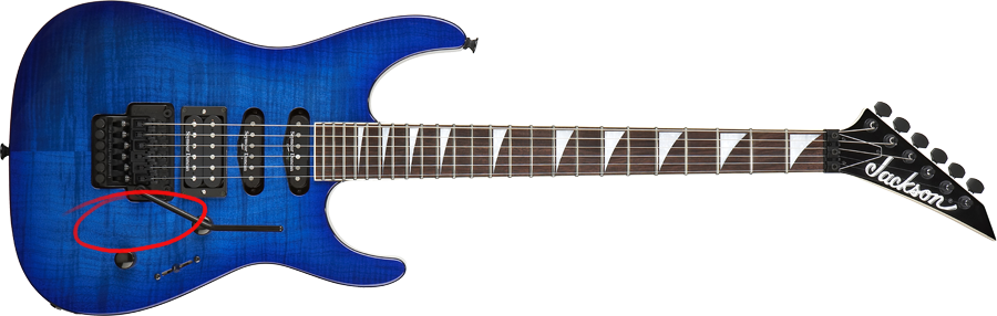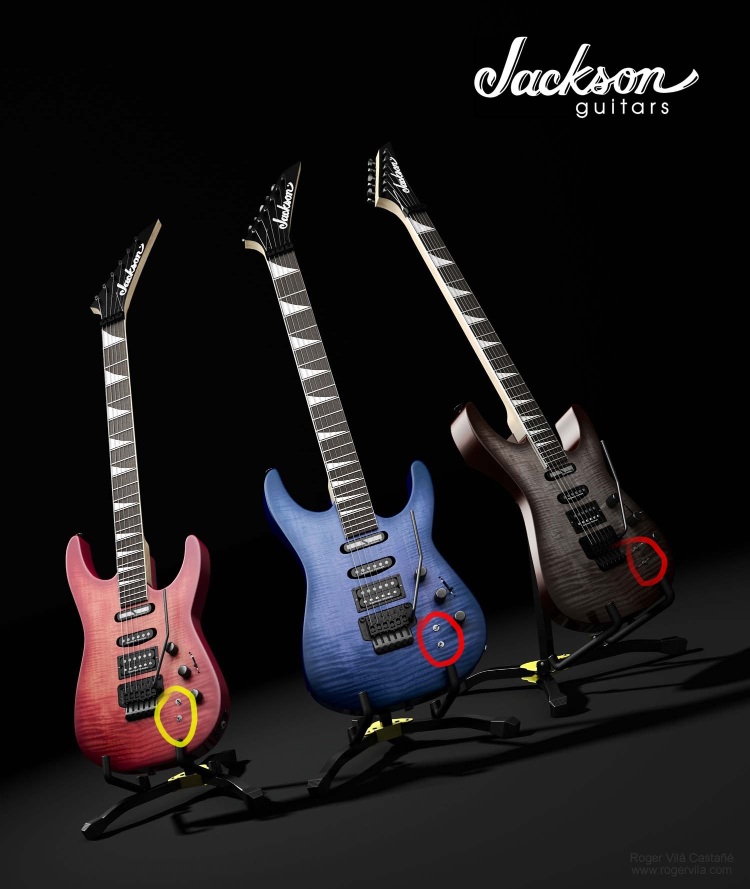 La tapita plástica que cubre la punta del selector de pastillas se ve un poco pequeña, y no sé que modelo de Jackson modelaste, pero el par de selectores metálicos cercanos al puente es algo que nunca he visto en una Jackson, o en alguna otra guitarra de serie, a excepción de algunos modelos custom que incorporan ese tipo de cosas a petición de los guitarristas que las encargan.