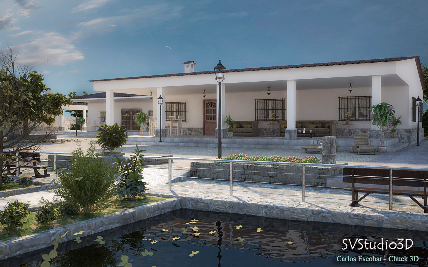 Comparto este nuevo trabajo que he terminado, es sobre un exterior rustico. Con casas de piedra, teja y un poco de ambiente de vegetación. Quise tratar de poner las hojas como que están cayendo en primer plano, para no verse tan descubierta el área del estanque.
