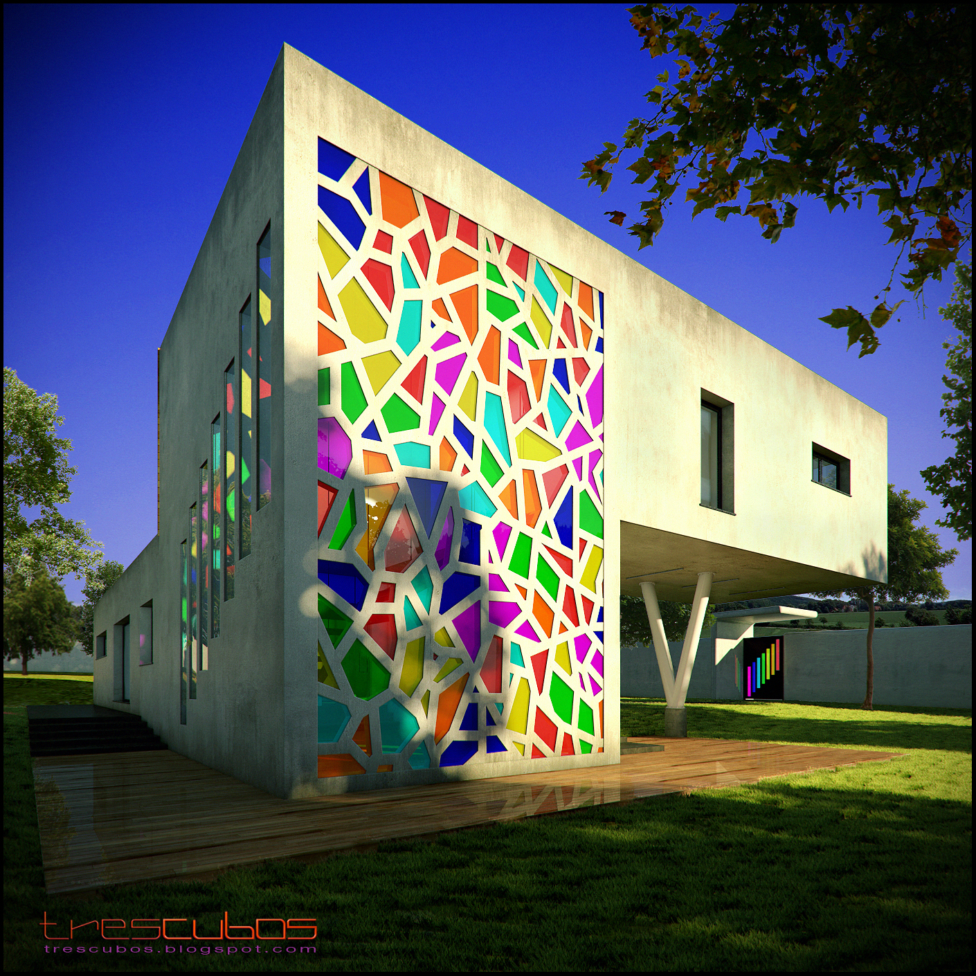 La arquitectura me gusta la iluminación me gusta mucho el ambiente es logrado es excelente las texturas en general muy bien logradas(excepto por el piso exterior de madera o de lo que sea, no lo entiendo muy bien), los puntos de vista de la cámara excelentes, el pasto tiene algo que no me gusta no sabría explicar exactamente que es, y en general toda la vegetación no se ve bien lograda más bien se ve mal, se notan mucho los recortes de los árboles de Photoshop también se nota mucho el recorte de la casa contra el entorno lo que le quita calidad en su integración con el mismo, el trabajo es bueno, pero lo podrías mejorar al punto de hacerlo perfecto. Saludos.